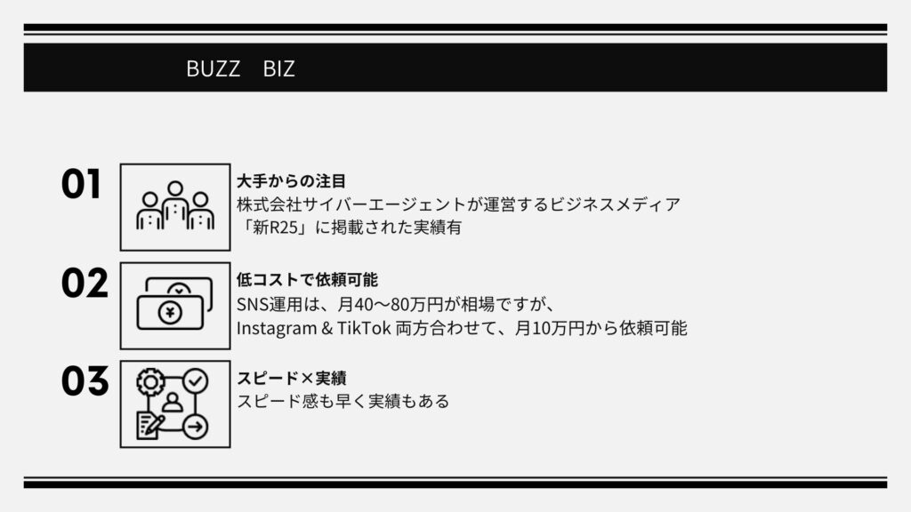 BIZ BUZZ は「バズを狙う構成要素のスコアリング」など独自手法で拡散を目指す点が特徴です。