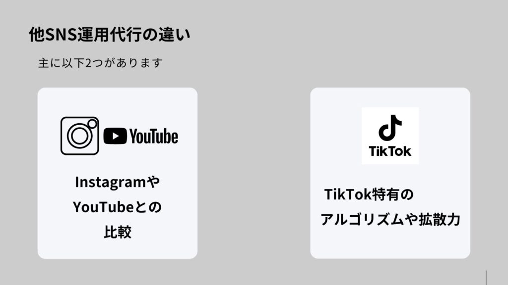 TikTok運用は即時性と拡散性が特徴で、新規ユーザーへ届きやすい点が他SNSとの大きな違いです。InstagramやYouTubeは既存フォロワーやチャンネル資産を活かす傾向があり媒体ごとに最適戦略が異なります。アルゴリズムや評価指標が違うため、同一素材のまま横展開すると効果が変わりやすい点が根拠です。 具体的にはYouTubeは長尺で深掘り、Instagramはビジュアル統一が強みで、TikTokは新規拡散を狙いやすいと言えます。複数媒体を運用する際は役割分担とKPI分離、編集方針の明確化が重要です。