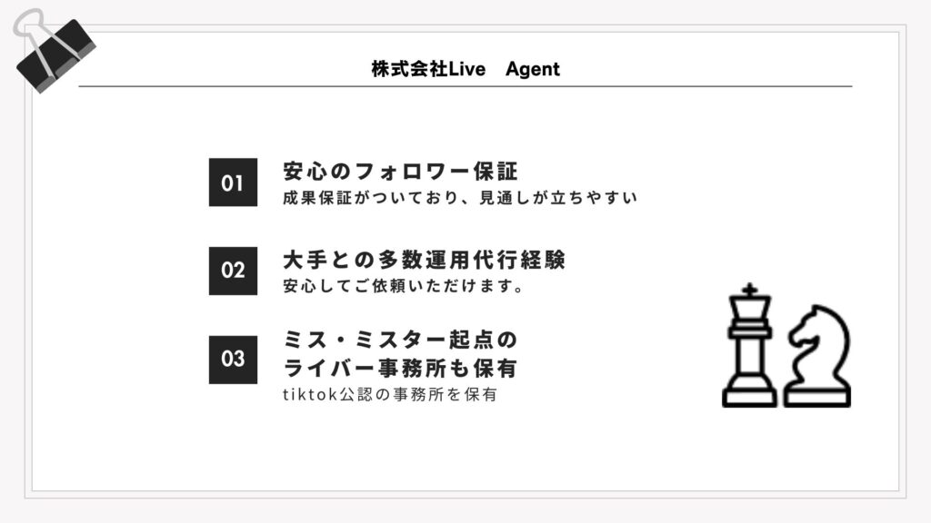 東京のTikTok運用代行企業のおすすめとして、無料コンサルや年間契約で1万人保証キャンペーンを行っている、LiveAgentが挙げられます。