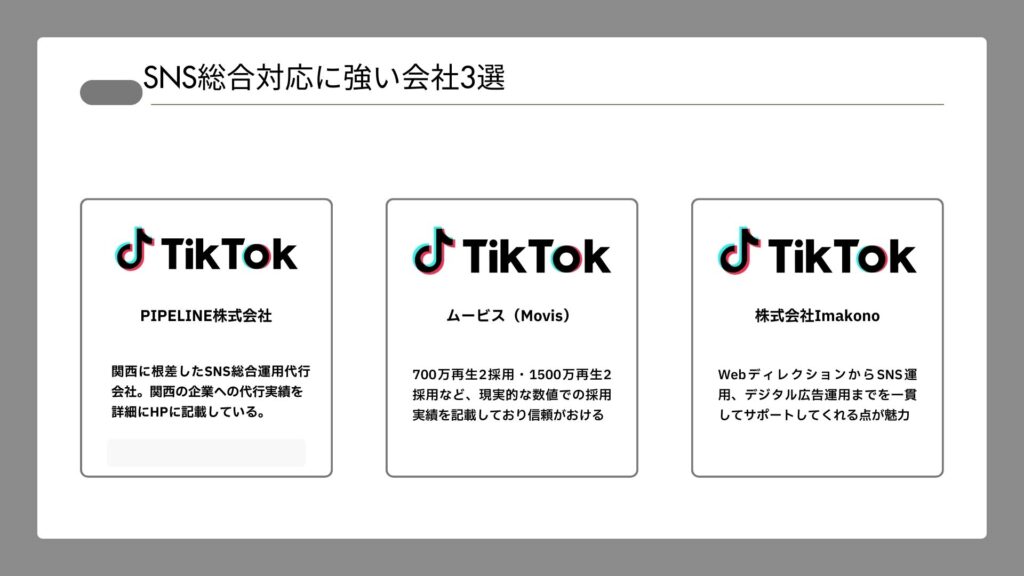 採用や海外対応を含むSNS運用支援で、TikTokにも対応するメニューがあります。