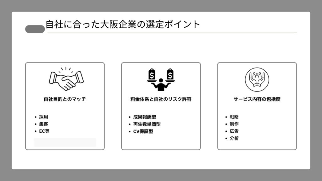 代行の選び方では、戦略〜制作〜検証の一貫性をチェックするのが基本です。