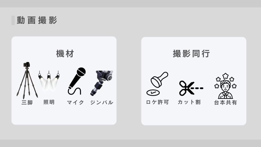 機材では、安定した品質には三脚・照明・マイク・ジンバル(手振れ補正やなめらかなアングルに有用だが、最新機種のスマホであれば代用可能)などの基本セットが有効です。その理由は、編集のアプリ機能が充実しており最小構成でも開始は可能である一方、基礎機材を整えることで品質の下振れを抑えられるからです。撮影を代行依頼しない場合は、準備段階で必要機材を手配しておくと無駄が減ります。例えば、個人はスマホ+ミニ三脚、企業は一眼+指向性マイク(ガンマイクであれば、屋外撮影時にも風切りオンを抑えた高品質な音声を収録可能(スマホでTypeCであればdjiのマイクがおすすめ(2万円程度)+ライト+三脚等)という構成があります。注意点は、社内で撮影を行う場合にスマホ三脚を購入するならスマホ三脚の安定性を確認し実機で選ぶことで(2000円前後〜購入可能)失敗を防げることです。